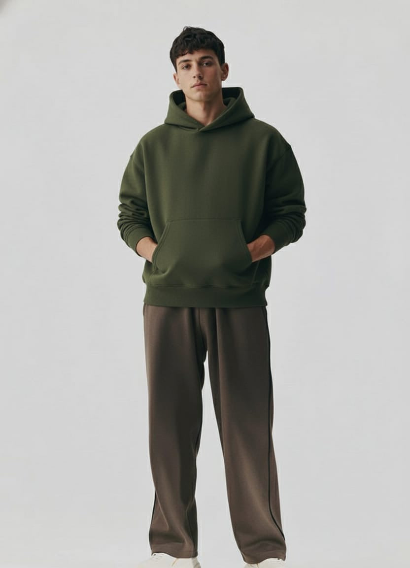 a plain olive green hoodie, neatly folded and centered on a neutral, sandy-beige background.