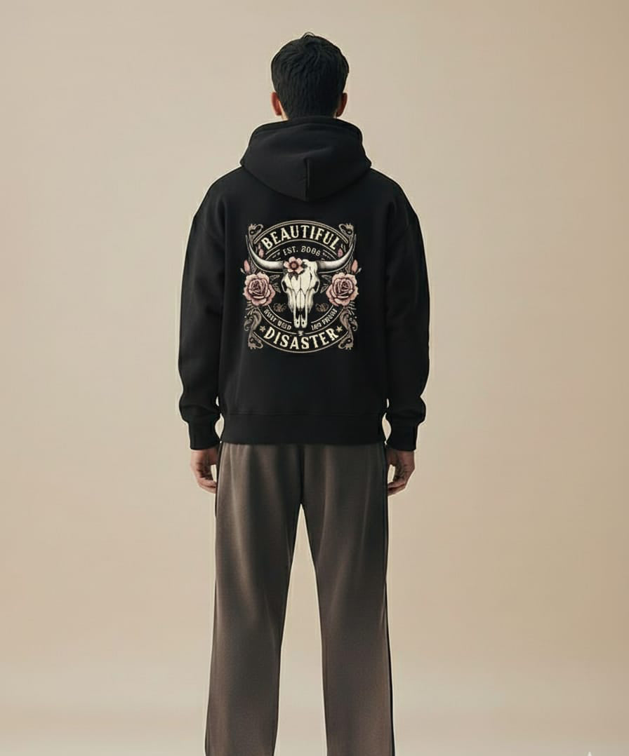 The most distinctive feature is the large, intricate graphic centered on the upper back of the hoodie. The design has a vintage or neo-traditional tattoo style: